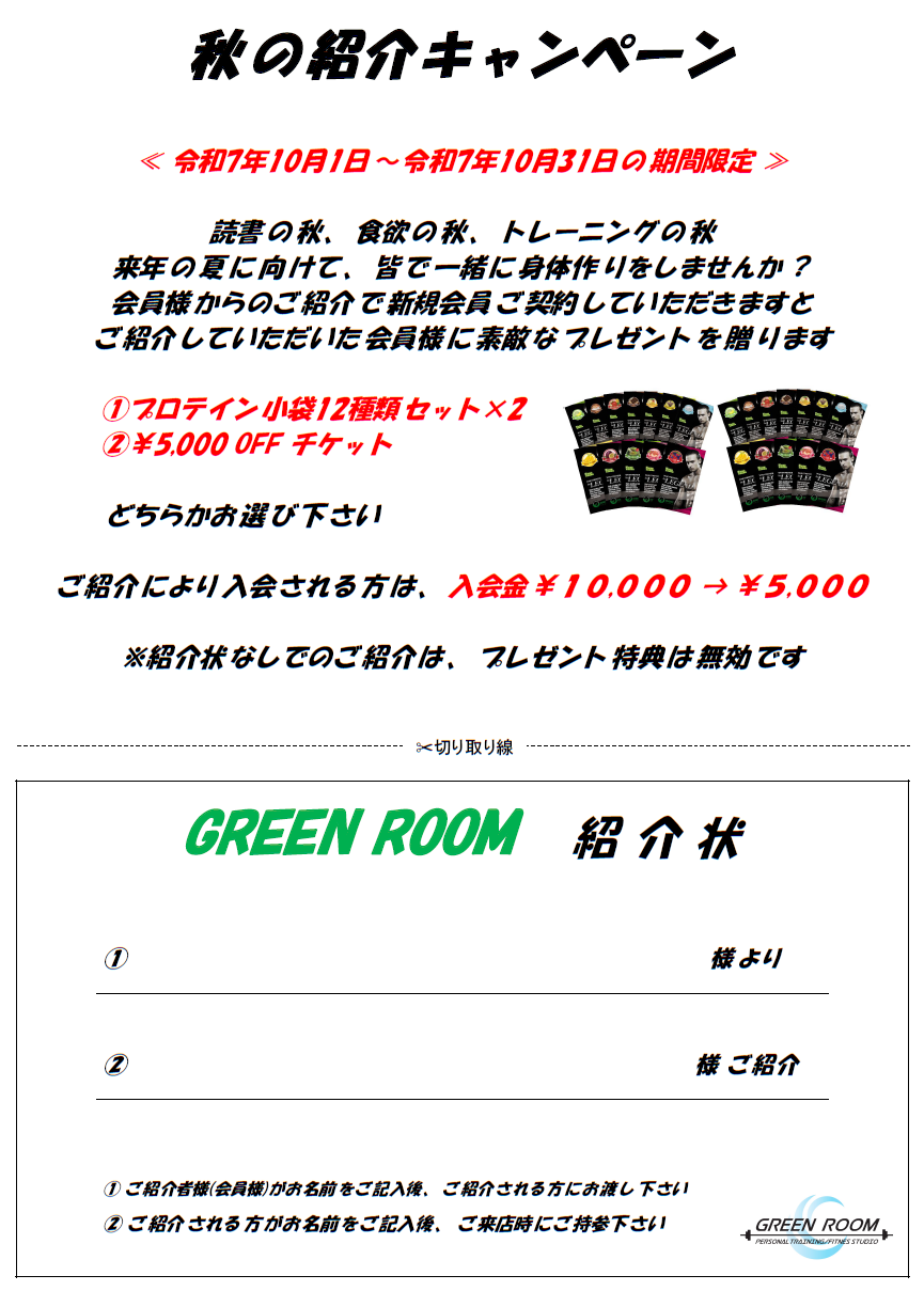 SEP 18 2025 未分類 秋の紹介キャンペーン グリーンルームの会員様のご家族、ご友人、お知り合いの方 会員様のご紹介でご入会していただくと 紹介する方も、される方も、大変お得です! 来年の夏に向けて、一緒にダイエットしませんか(^^) 未分類 デッドリフトチャレンジがスタート プランクチャレンジがスタート