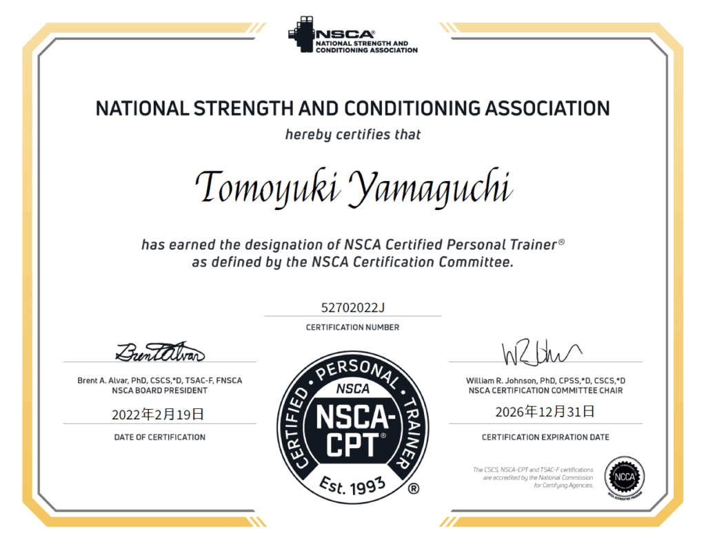 山口トレーナー NSCA-CPT(トレーナー国際ライセンス) 更新完了